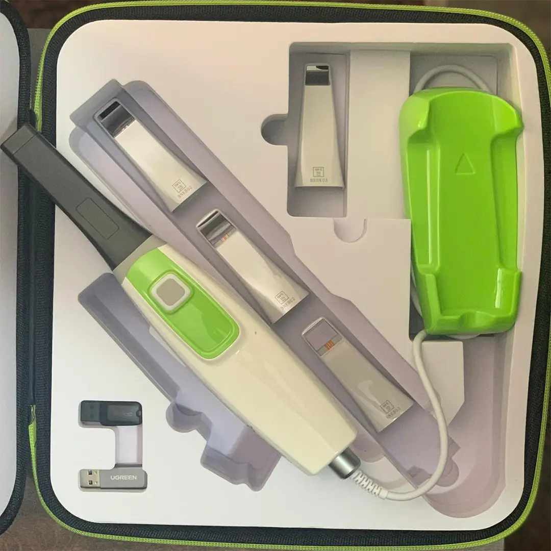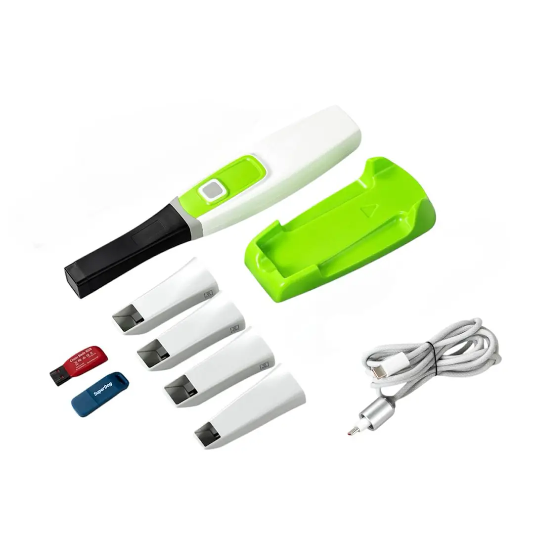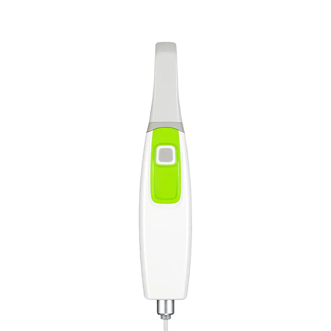 The device is designed with a slim, ergonomic form factor for comfortable handling during scanning. It typically features detachable, autoclavable scanning tips, ensuring maximum hygiene and infection control between patients.