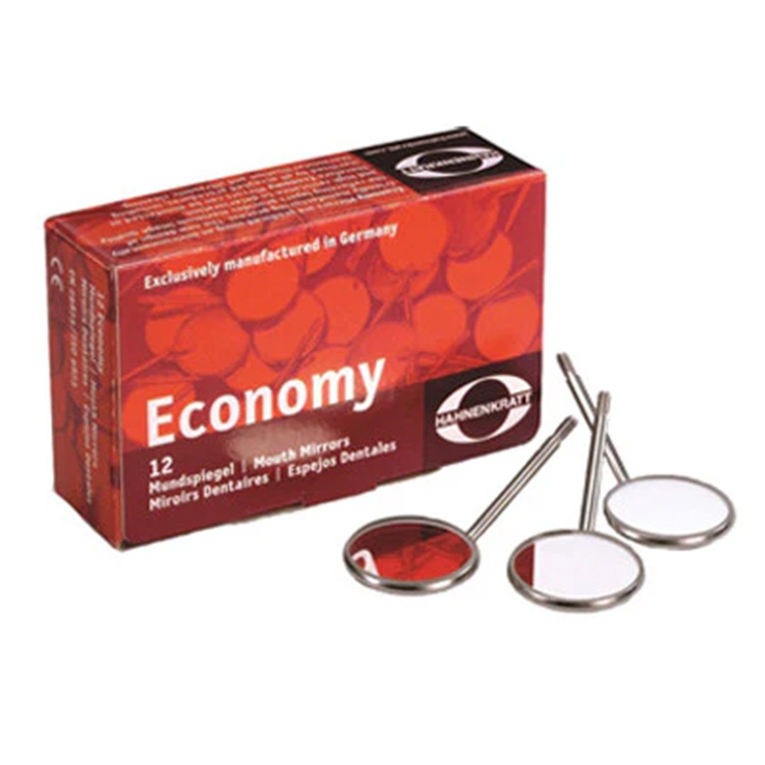 The defining characteristic of the ECONOMY line is its Rear Surface (RS) mirror coating. Unlike Hahnenkratt’s premium Front Surface (FS) mirrors, the ECONOMY line uses a reflective silver layer that is applied to the back of the glass, which is the traditional construction method for dental mouth mirrors.