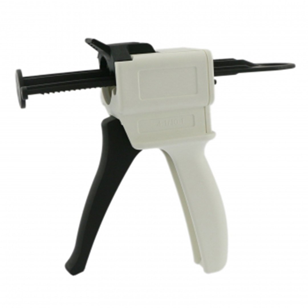The system operates as a manual, pistol-grip mixing gun. A dual-barrel cartridge is loaded into the dispenser, and a static mixing tip is attached. When the handle is squeezed, the internal plungers push both components simultaneously through the mixing tip, where they are thoroughly blended before being dispensed smoothly and evenly.